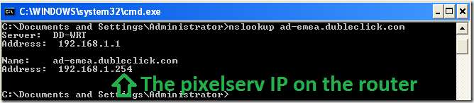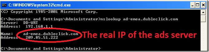 Du kan gjøre dette ved å utstede kommandoen nslookup mot det "fornærmende" domenet. For eksempel er “ad-emea.dubleclick.com” en del av de blokkerte vertene fra den personlige listen. Ved å utstede "nslookup ad-emea.dubleclick.com" i en ledetekst, bør resultatet se ut som:
