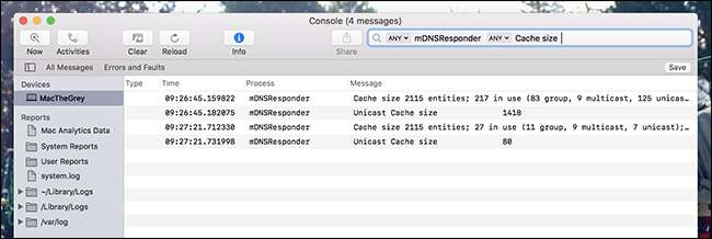 For en mer global (ikke stedsspesifikk) metode, kan du også bekrefte at hurtigbufferen tilbakestilles med konsollen, som du finner i Programmer> Verktøy eller ved å bruke Spotlight. Når systemet ditt er uthevet i venstre panel, skriver du inn "mDNSResponder" i søkeboksen, trykker Enter, skriver "Cache størrelse" ved siden av det første spørsmålet, og deretter trykker du Enter. Som dette: