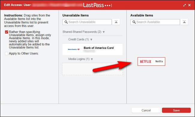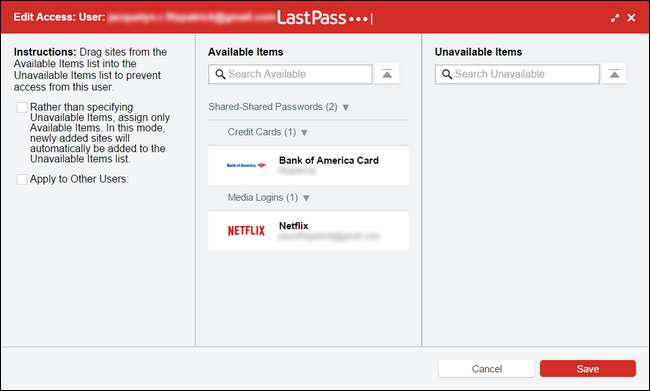 Det er mye fortsetter her, så la oss bryte det ned. Først har du en kolonne med tilgjengelige elementer som er alle tingene i de delte mappene. Du kan se her at vi har et perfekt par for å demonstrere å sette opp begrensninger for et barns konto: et Bank of America-kredittkort i kredittkortmappen og en Netflix-konto i Media Logins-mappen. Vi vil helt klart at ungen skal få tilgang til Netflix, men ikke kredittkortet vårt.
