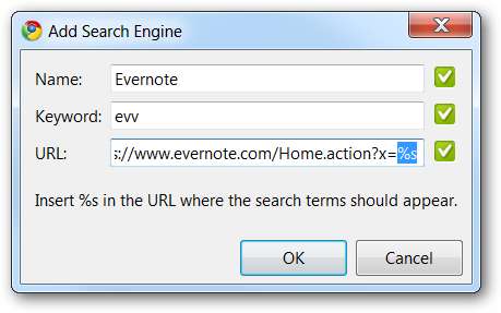 Og skriv deretter inn søkeinformasjonen. Jeg kalte min Evernote, og brukte nøkkelordet "evv" siden det neppe blir skrevet for noen annen URL, og det er veldig lett å huske. Sett deretter URL-adressen til dette: