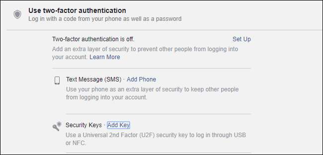 Klikk på "Legg til nøkkel" til høyre for sikkerhetsnøkler her for å legge til U2F-nøkkelen din som en godkjenningsmetode. Du kan også legge til andre tofaktorautentiseringsmetoder herfra, inkludert tekstmeldinger sendt til smarttelefonen og mobilapper som genererer koder for deg.