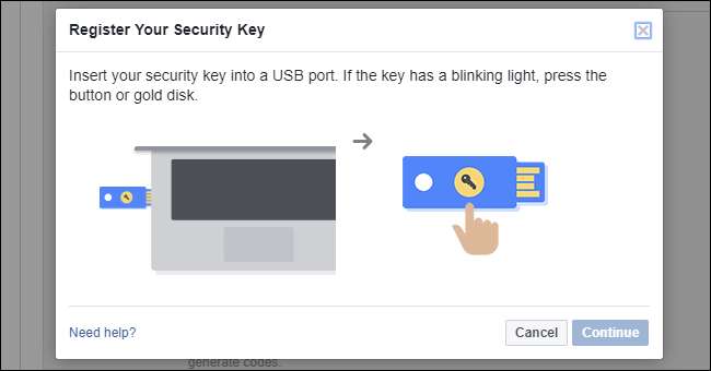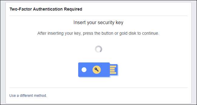 Når du logger på Facebook i fremtiden, blir du bedt om å sette inn sikkerhetsnøkkelen din for å fortsette. Du kan også klikke på koblingen "Bruk en annen metode" og velge en annen tofaktorautentiseringsmetode du har aktivert. For eksempel kan du få en tekstmelding sendt til smarttelefonen din hvis du ikke har USB-nøkkelen din.