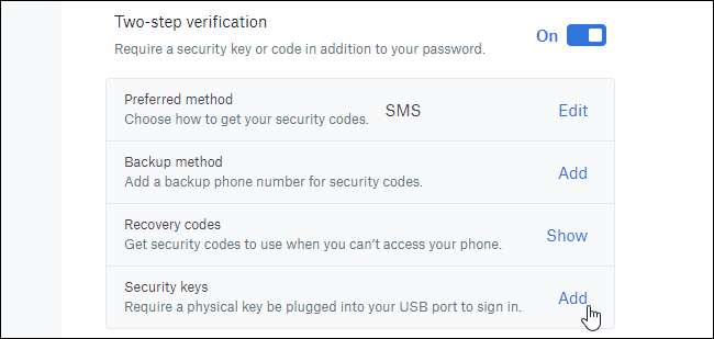 Når du er ferdig - eller hvis du allerede har aktivert totrinnsbekreftelse - klikker du på "Legg til" ved siden av sikkerhetsnøkler.