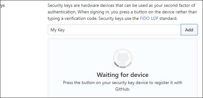 Skriv inn et kallenavn for nøkkelen, klikk på Legg til, og sett deretter nøkkelen inn i en USB-port på datamaskinen din, og trykk på knappen.