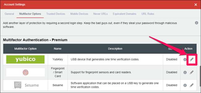 Klikk på "Multifactor Options" -fanen og bla ned til "Yubico" eller "YubiKey". Klikk på Rediger-ikonet ved siden av det.