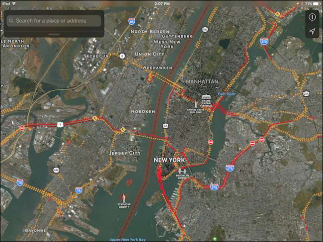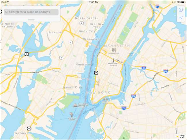 Her er standardvisningen som vist på en iPad. Du kan gjøre alle vanlige ting som å zoome og snu, samt å søke etter et bestemt sted eller en bestemt adresse.