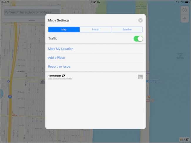 Dette vil avsløre Maps-innstillingene. Det er mange alternativer her, inkludert muligheten til å legge til et sted og merke posisjonen din, men det vi er mest interessert i er de tre kartvisningene øverst.