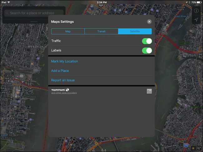 Når vi ser på Kartinnstillinger igjen, trykker vi på Satellittvisning og aktiverer trafikk og etikettoverlegg.