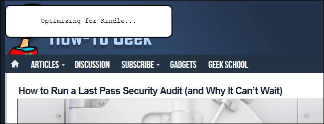 Når bokmerket er på plass, kan du klikke på det mens du leser en artikkel du vil sende til Kindle. Når du gjør det, ser du et lite varslingsvindu øverst til venstre som forteller deg hva som skjer:
