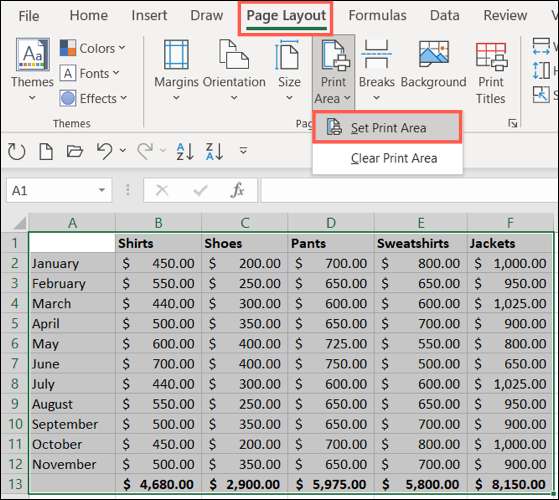 Du kan angi ett eller flere utskriftsområder i samme Excel-ark. For å angi et enkelt utskriftsområde, Velg cellene . Deretter går du til fanen Sideoppsett og klikker på rullegardinmenyen Skriv ut område i båndet. Velg "Angi utskriftsområde".