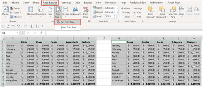Her valgte vi celler A1 til F13, holdt Ctrl-tasten, og deretter valgte celler H1 til M13. Deretter, gå til fanen Sideoppsett og velg "Angi utskriftsområde" i rullegardinmenyen Skriv område. Når det er på tide å skrive ut, vises hvert utskriftsområde på egen side.
