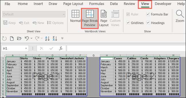 Når du har konfigurert ditt utskriftsområde, vil du kanskje bekrefte at du har valgt de riktige cellene. Åpne kategorien Vis og velg "Sidepause forhåndsvisning". Du vil da se hvert utskriftsområde du har satt for det arket.