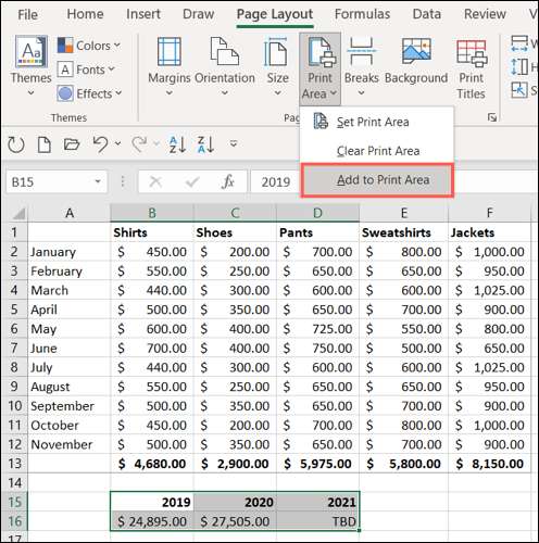 Hvis du bare vil inkludere et annet sett med celler i oppsettet for utskriftsområdet, velger du cellene. Deretter går du til fanen Sideoppsett og velg "Legg til i utskriftsområde" i rullegardinmenyen Skriv område.