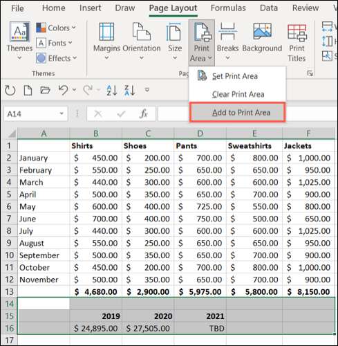 Nå hvis du vil øke størrelsen på et nåværende utskriftsområde for å inkludere flere celler, må du velge cellene ved siden av området. Deretter velger du "Legg til i utskriftsområde" i rullegardinmenyen Skriv ut område.