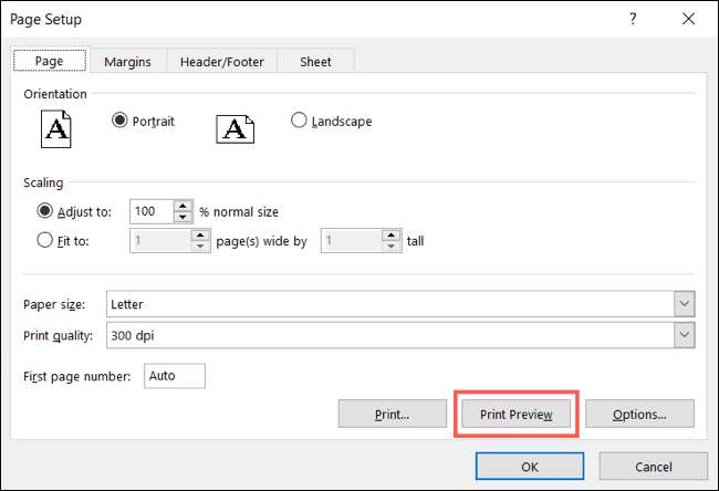 Hvis du vil se en rask forhåndsvisning av hvordan siden vil se når du skriver ut det, går du tilbake til fanen Sideoppsett. Klikk på pilen nederst til høyre på siden Sideoppsett delen av båndet.