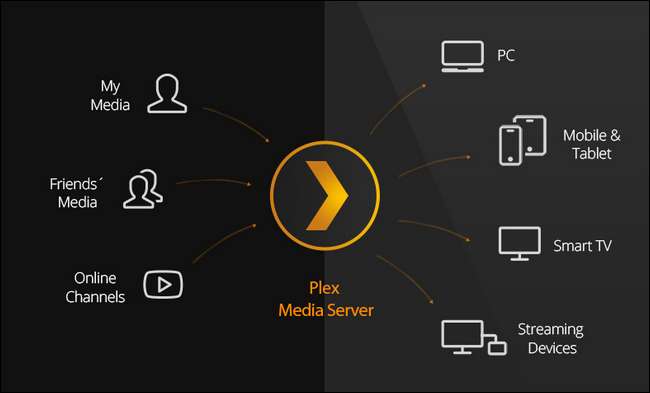 Plex-modellen er enkel: du parkerer alle media på en datamaskin med Plex-serverprogramvaren installert, og deretter installerer du Plex på alle andre enheter. Du kan installere den på Windows-, Linux- eller Mac-datamaskiner samt Android og iOS, videospillkonsoller som Xbox og PlayStation, Apple TV, og det er til og med smarte TV-er som følger med Plex innebygd rett inn. Deretter, fra hvilken som helst av disse enhetene, kan du få tilgang til hele mediebiblioteket ditt og se det uten problemer.