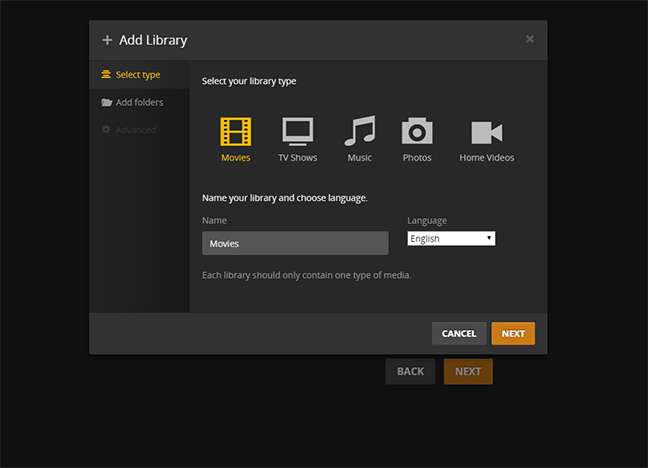 La oss starte med å legge til noen filmfiler. Velg "Filmer" og navngi filmbiblioteket ditt i rullegardinmenyen som vises, og velg et språk. For de fleste bør det være nok å la standardnavnet "Filmer" være. Klikk "Neste".