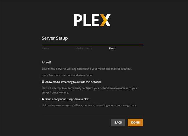 Det siste trinnet i det første serveroppsettet er å tillate ekstern tilgang til medieserveren din og sende anonyme data til Plex. Begge er sjekket som standard, og vi anbefaler at du lar dem være merket med mindre du har en presserende grunn til å fjerne merket for dem. Velg "Ferdig".