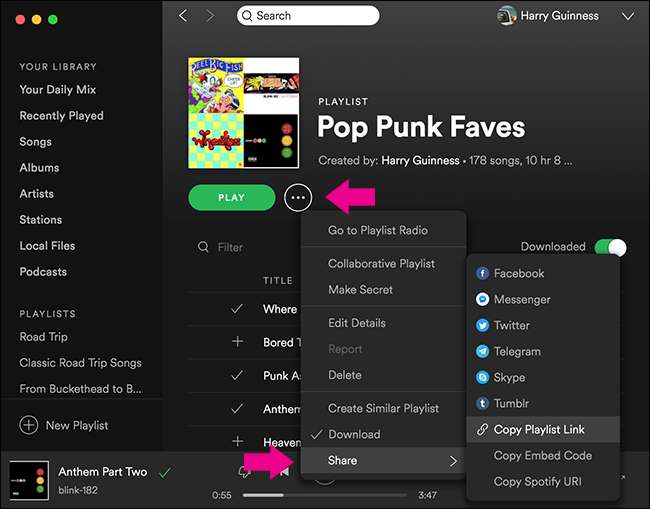 Spotify har et par innebygde alternativer, som deling via Facebook, Messenger og Twitter. Du kan også bare velge Kopier spillelistekobling for å kopiere en lenke til spillelisten til utklippstavlen. Her er lenken til min Pop Punk Faves-spilleliste . Hvis du klikker på den lenken, åpnes spillelisten i et nettleservindu, som vennen din kan spille av i Spotify.