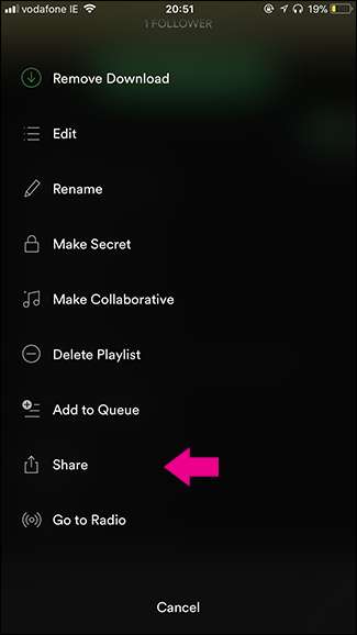 Åpne Spotify og gå til spillelisten du vil dele. Klikk eller trykk på de tre små prikkene øverst og velg Del. Dette vil gi deg alle delingsalternativene. Slik ser det ut med desktop-appen.