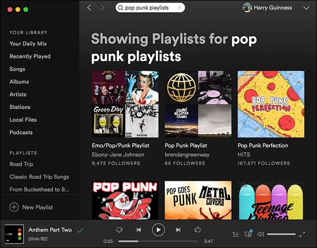 Du kan dele spillelistene dine med så mange venner du vil bare ved å dele lenken, eller legge den ut et sted offentlig som Twitter-feeden din. Men hvis du vil at fremmede skal kunne oppdage det, må du dele det offentlig gjennom Spotify. På denne måten vil den vises når folk søker i Spotify. I skjermbildet nedenfor kan du se at jeg har søkt etter noen andre pop punk-spillelister.
