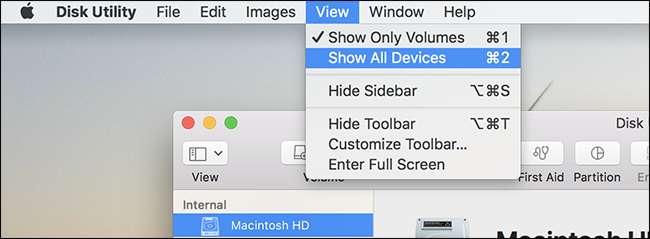 Dette er fordi Disk Utilitiys standard er å bare vise formaterte volumer. Dette betyr at tom stasjon - hvilken som helst stasjon uten formaterte partisjoner, det vil si - ikke vises i det hele tatt. Det er ikke veldig ideelt i denne situasjonen, spesielt siden popupen om den uformaterte stasjonen er det som førte oss hit i utgangspunktet.