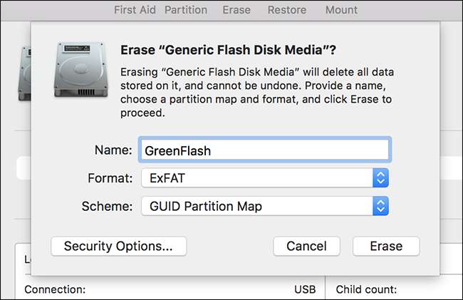 Navngi stasjonen din, velg et filsystem , og klikk deretter på "Slett." Akkurat slik har du formatert stasjonen din. Fra nå av vises den i Disk Utility og Finder likt.
