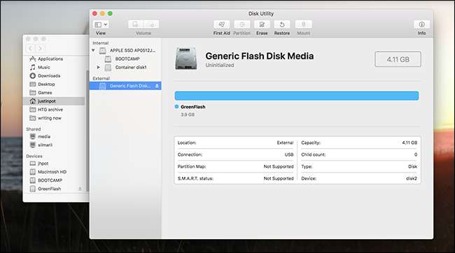 Dette er ikke akkurat den typen klare, brukervennlige språk du forventer av Apple, er det? Og det blir merkeligere: Hvis du klikker på "Initialiser", åpnes Diskverktøy - noe som er fornuftig - men når dette skrives vises ikke stasjoner uten partisjoner som standard.
