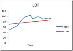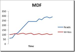 Ved å bruke eksemplet ovenfor med grafene (som representerer skriver og leser for OS, LDF og MDF), vil vi plassere MDF-filen vår på den raskeste stasjonen siden MDF er den travleste. Hvis vår Diskspd-analyse viste at F var vår raskeste stasjon, ville vi plassere MDF-filen vår på stasjon F.