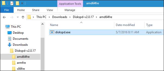 Når du har lastet den ned, må du trekke ut innholdet i .zip-filen til en mappe på datamaskinen din. Merk at arkivet inneholder tre forskjellige "diskspd.exe" filer. Den i “amd64fre” -mappen er for 64-biters Windows-PCer, mens den i “x86fre” -mappen er for 32-biters Windows-PCer. Hvis du bruker en 64-biters versjon av Windows, og du sannsynligvis er det, vil du sannsynligvis bruke 64-bitersversjonen.