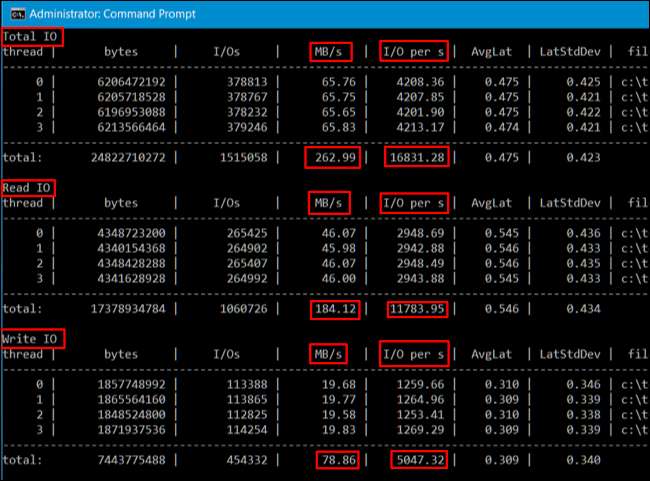Hvis du ser på resultatene, ser du gjennomsnittlig MB / s som stasjonen nådde under testen - hvor mange skriveoperasjoner som ble utført i sekundet, hvor mange leseoperasjoner som ble utført i sekundet, og den totale mengden inngang / utgang (IO) per sekund. Denne statistikken er mest nyttig når du sammenligner flere stasjoner for å se hvilke som er raskere for visse operasjoner, men de vil også fortelle deg nøyaktig hvor mye IO en harddisk kan takle.