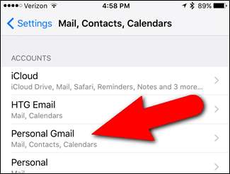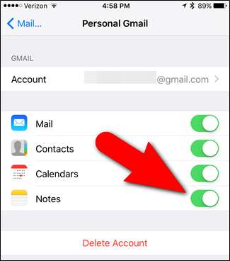 Trykk på kontoen du vil aktivere Notes for. Alt som er oppført under kontonavnet er aktivert for den kontoen. For min personlige Gmail-konto er Mail, Kontakter og Kalendere aktivert, men ikke Notater.