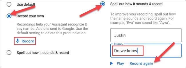 Du vil se en "Name Pronunciation" -delen. Du kan trykke på "Play" for å høre hvordan Google sier navnet som standard. velg "Ta opp din egen" for å si det selv, eller velg "Stave ut hvordan det høres ut & amp; Ta opp "for å stave det ut fonetisk.