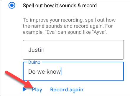 Etter at du har bestemt navnet eller angir den fonetiske uttalen, kan du trykke på "Play" for å høre Google Assistant, si det igjen, forhåpentligvis riktig denne gangen.