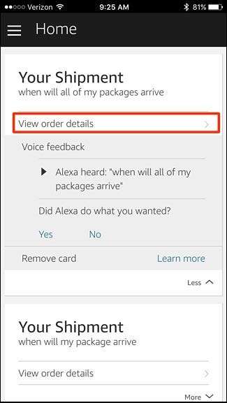 Du kan imidlertid gå inn i Alexa-appen på hovedsiden der den viser den siste talekommandoen din og trykke på "Vis bestillingsdetaljer".