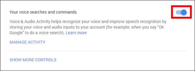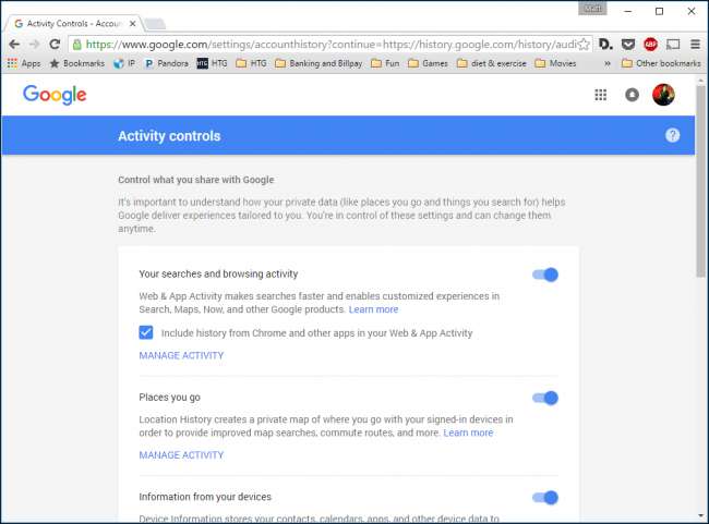 Du kan klikke på av / på-bryteren for hver tjeneste, i tillegg til "Manage Activity" -linken for å vise og muligens slette historikken.
