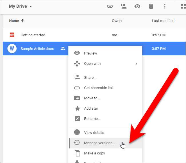 Det er imidlertid en enkel måte å beholde den samme lenken for den delte filen. Logg deg på Google Drive-kontoen din i en nettleser. Finn filen du vil oppdatere, høyreklikk på den og velg “Manage versions”.