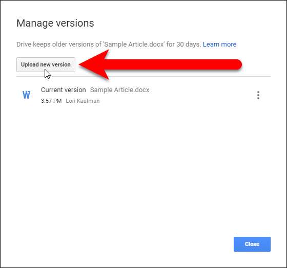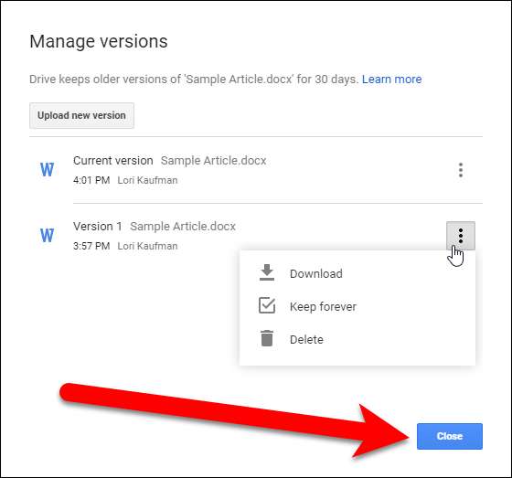 Hver versjon av filen er oppført i dialogboksen Administrer versjoner, og filen du nettopp lastet opp ble merket som den nåværende versjonen. Dette er en annen praktisk funksjon i Administrer versjoner. Den lar deg få tilgang til tidligere versjoner av filer og laste dem ned, velge å beholde dem for alltid eller slette dem. Klikk "Lukk".