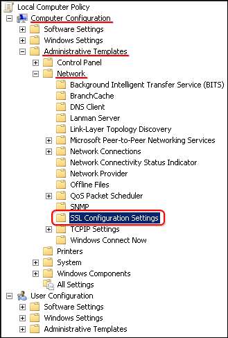 På venstre side utvider du datamaskinkonfigurasjon, administrative maler, nettverk og klikker deretter på SSL-konfigurasjonsinnstillinger.