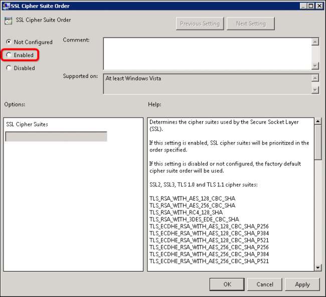 Som standard er “Ikke konfigurert” -knappen valgt. Klikk på "Enabled" -knappen for å redigere serverens Cipher Suites.