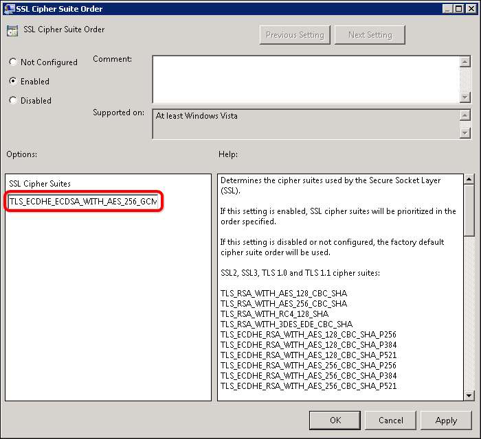 Du kan gå gjennom listen og legge til eller fjerne hjertelig med én begrensning; listen kan ikke bestå av mer enn 1023 tegn. Dette er spesielt irriterende fordi krypteringssuitene har lange navn som “TLS_ECDHE_ECDSA_WITH_AES_256_GCM_SHA384_P384”, så velg nøye. Jeg anbefaler å bruke listen satt sammen av Steve Gibson på GRC.com: https://www.grc.com/miscfiles/SChannel_Cipher_Suites.txt .