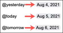 Ved hjelp av @ (AT) -symbolet kan du sette inn en rask interaktiv dato som i går, i dag eller i morgen.