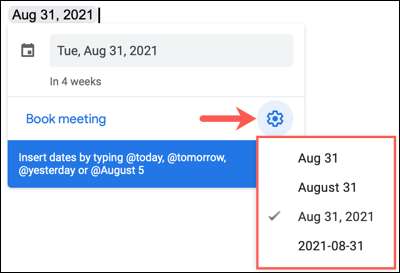 Når du har din interaktive dato i dokumentet ditt, svinger markøren eller klikker den til Vis Smart Chip . På høyre side av brikken klikker du på girikonet. Du vil se tilgjengelige datoformater og bare klikk for å velge en.