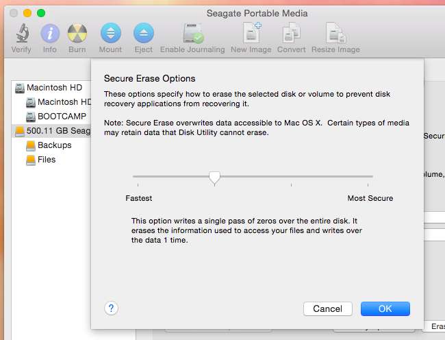 Åpne Diskverktøy-applikasjonen på en Mac, velg stasjonen i listen og klikk på Erase-overskriften. Klikk på Sikkerhetsalternativer og be den om å slette stasjonen en gang, og deretter slette den.