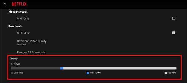 Mens du alltid kan sjekke lagringen på enheten din ved hjelp av de innebygde OS-verktøyene, kan du også enkelt sjekke lagringen rett fra Neflix-appens Innstillinger-meny, som har den ekstra bonusen at du umiddelbart viser hvor mye lagring som tygges av Netflix frakoblede lagring (mørk grå er plassert brukt av ikke-Netflix kilder, blå brukes av Netflix, og lys grå er ledig plass).