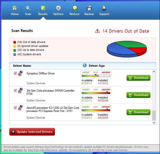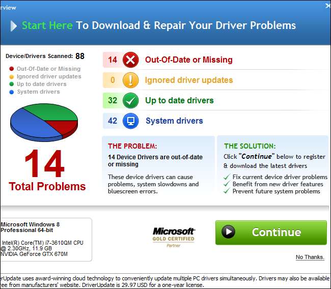Vi installerte denne programvaren slik at du ikke trenger å - egentlig, ikke prøv dette hjemme. Vi startet med DriverUpdate. det vil skanne datamaskinen din for drivere gratis, og deretter kan du betale $ 30 for å motta gratis automatiske driveroppdateringer i et år. Det er uansett hva det lover.