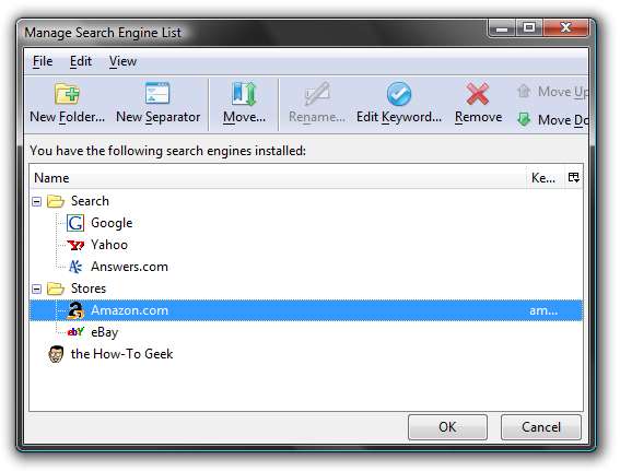 Med Organize Search Engines-utvidelsen for Firefox kan du omorganisere alle søkemotorene i mapper, noe som kan være veldig nyttig for å skille ut de ofte brukte fra spesialitetssøkene.