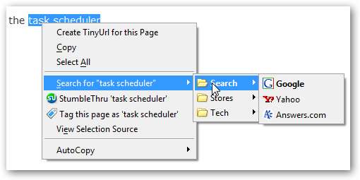 Denne utvidelsen er spesielt nyttig, men hvis du også installerer Context Search-utvidelsen, som lar deg høyreklikke på et utvalg på siden og velge fra mappene til søkemotorer: