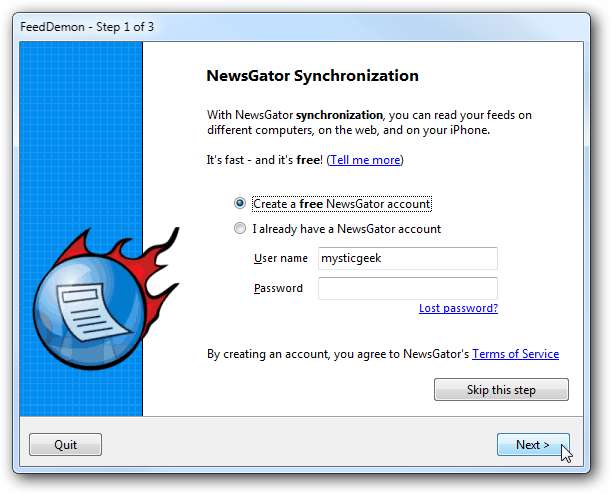 Etter installasjon er det et alternativ å registrere seg med NewsGator, som er gratis tjeneste som gir tilgang til feeds fra forskjellige steder. Det er ikke nødvendig å kjøre leseren, så hvis du ikke bryr deg om å registrere deg, kan du bare hoppe over trinnet.