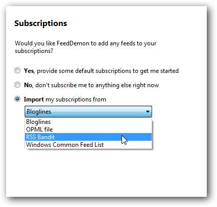 Hvis du registrerer deg for den gratis NewsGator-kontoen, kan du velge å motta standard abonnementsliste eller importere abonnementer fra andre tjenester.